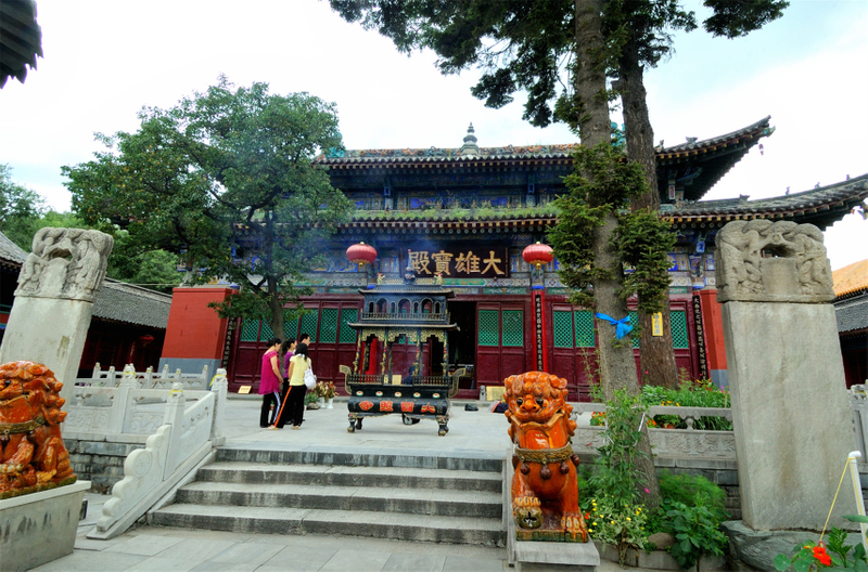 圆照寺位于显通寺东北面,古称普宁寺,创建于元至大二年(1309),明、清两代曾予重修。明代永乐初年,印度高僧室利沙来中国弘扬佛法,皇帝封他为“圆觉妙应辅国光范大善国师”,赐金印、旌幡,并重新建寺。明宣德年间,皇帝召他进京,面授弘扬佛法事宜。他逝世后,明宣宗朱瞻基敕分舍利为二,一在京西建塔并建寺,称为真觉寺;一在五台山普宁寺奠基建塔,并重修此寺,改名圆照寺。明永乐十二年(1414),西藏黄教祖师宗喀巴的弟子释迦也失在此寺弘扬黄教,这就是黄教传入五台山的开始。 寺宇坐北向南,占地12600平方米,共有殿堂楼阁数百间,均为明、清建筑。山门为三开间,四架椽,单檐歇山顶,前后出廊,并列三门。三门两旁,又有两门,谓之五朝门。天王殿,三开间,单檐歇山顶,前檐下挂一蓝底金字的乾隆御匾“震那金界”。殿内木龛中供跏趺半坐,右手托布袋,左手拿念珠的大肚弥勒佛,后面是身穿甲胄,手持金刚杵拄 地的韦驮菩萨,两侧为威武雄壮、神采飞扬的四大天王。天王殿左右为吉祥门和般若门,进了此门,便是大雄宝殿。大雄宝殿面宽5间,进深3间,重檐歇山顶,为铁林果禅师于明弘治年间所建。殿内佛坛正中为释迦牟尼佛,东为药师佛,西为阿弥陀佛。周围还有护法金刚、大梵天、帝释天和文殊菩萨等像。这些塑像做工精细,神态庄严,其中尤以三世佛像塑法为最。大雄宝殿的两山及佛台后面为十八罗汉和二十四诸天彩色悬塑。佛坛背面为观音、文殊、普贤三大士和五百罗汉过江悬塑。 殿后,有座用砖砌成的金刚宝座式的白塔,名曰室利沙塔。此塔造型奇特,座为石砌方形基台,长12.2米、宽10.5米、高2.3米。塔基中央为一特别高大的覆钵式的砖塔,高达17米。基台四隅各建一座覆钵式的小砖塔。大塔塔座为回字形的双层束腰须弥座,敦厚高大,装饰华丽,稳如泰山。上置上粗下细的瓮形覆钵,塔身上为下粗上细的九级相轮和装饰精致、悬以风铎的华盖,上为一座覆钵式的小塔刹顶。其余四隅的小塔,形制一样,塔座为四角束腰须弥座,塔身为上粗下细的瓮形覆钵,塔刹由九级相轮和华盖、宝珠构成。五塔都是砖砌,通身均为白色,夜色来临,银光闪烁,锃亮耀眼。该塔建于明宣德九年(1435),比北京真觉寺的金刚宝座塔早39年,高出1.2米;且和印度佛陀伽耶的金刚宝座塔相似,座子较低,四隅小塔甚小,中央一塔硕大。所以说,圆照寺这座室利沙塔更具印度金刚宝座塔的特色,是中印文化交流的标志,也是中尼友谊的象征,还是我国最早最高的金刚宝座塔。 塔后为都纲殿,原为供奉室利沙之处。现在佛坛上,前面供黄教创始人宗喀巴大师和其两位弟子:左为克主杰·格雷贝桑、右为贾曹杰·达玛仁钦。后面供毗卢遮那佛、药师佛、释迦牟尼佛、阿弥陀佛和四臂观音。 都纲殿后院为藏经楼,楼上置《大藏经》,楼下为罗汉堂,堂正面供五尊缅甸玉佛:主尊为毗卢遮那佛,配以东方阿世佛、南方宝生佛、西方阿弥陀佛和北方不空成就佛,称为五方佛。两山墙供观音菩萨和地藏菩萨,并装有250块青石板,以每块上雕2尊罗汉像,共计500尊,故名罗汉堂。 清代时,五台山出现了十大青庙。它们分别是显通寺、塔院寺、殊像寺、广宗寺、圆照寺、碧山寺、南山寺、金阁寺、永安寺和灵境寺。