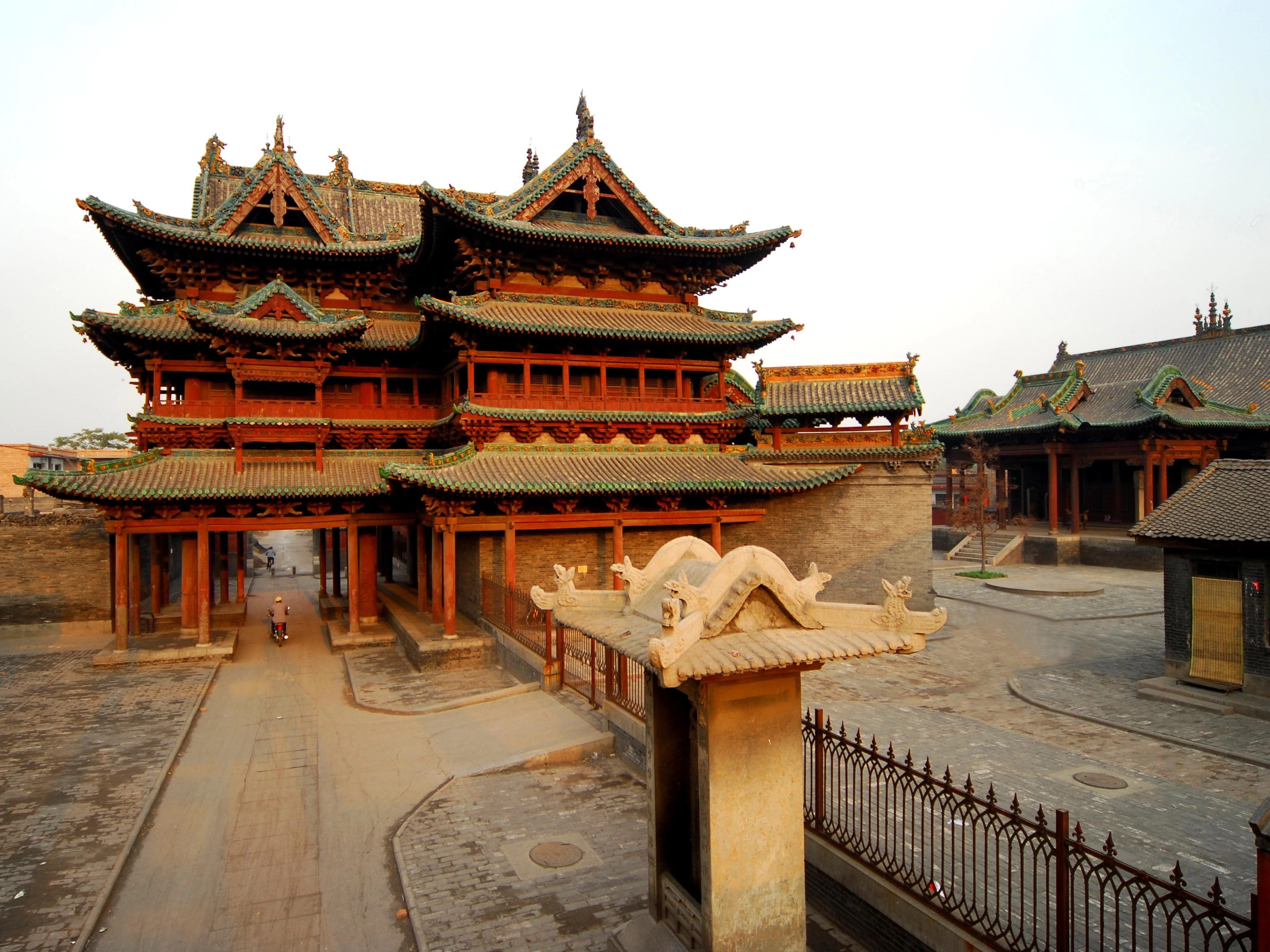 祆神楼位于介休市城区城路东,为三结义庙的附属建筑物。祆神楼集山门、戏楼、过街楼的作用于一身,是介休市的标志性和景观性建筑之一。 楼创建于北宋,明万历或嘉靖年间重修,后毁,现存建筑为清康熙年间重建。建造工艺复杂,气势恢宏,蔚为壮观。三重檐歇山顶,转顶木结构,正面呈“凸”字形,周围有回廊,进深20米。其中的过街楼部分面阔三间,进深三间,突出于回廊外;较宽部分即乐楼面阔五间,进深四间。祆神楼的下层是山门,上层是戏楼,中心为神龛。楼高两层,约25米,加上一重檐和二重檐之间的平座和顶部重檐,实为四层,楼的主要承重部分由四根高大的通柱支撑,直通上层梁架。 祆神楼的建筑艺术主要体现在楼身木构的设计上,斗拱密布,鳞次栉比,加上如意头合龙形头的昂嘴耍头,体现了典型的清初山西民间营造技法。楼顶三重檐,十字歇山顶,琉璃脊饰。平座之上所出的十字歇山顶抱厦,玲珑别致,匠心巧妙,避免了因楼体高大而招致的呆板,而且在设计的深度、广度比例协调上,都显示了充分的科学性和实用性,并杂糅进艺术美学,在建筑艺术上达到了很高的成就,是中国古代楼阁式建筑中的佳作。 祆教又称火袄教或拜火教,由波斯人琐罗亚斯德创立,约在公元6世纪前期由中亚传入我国。
