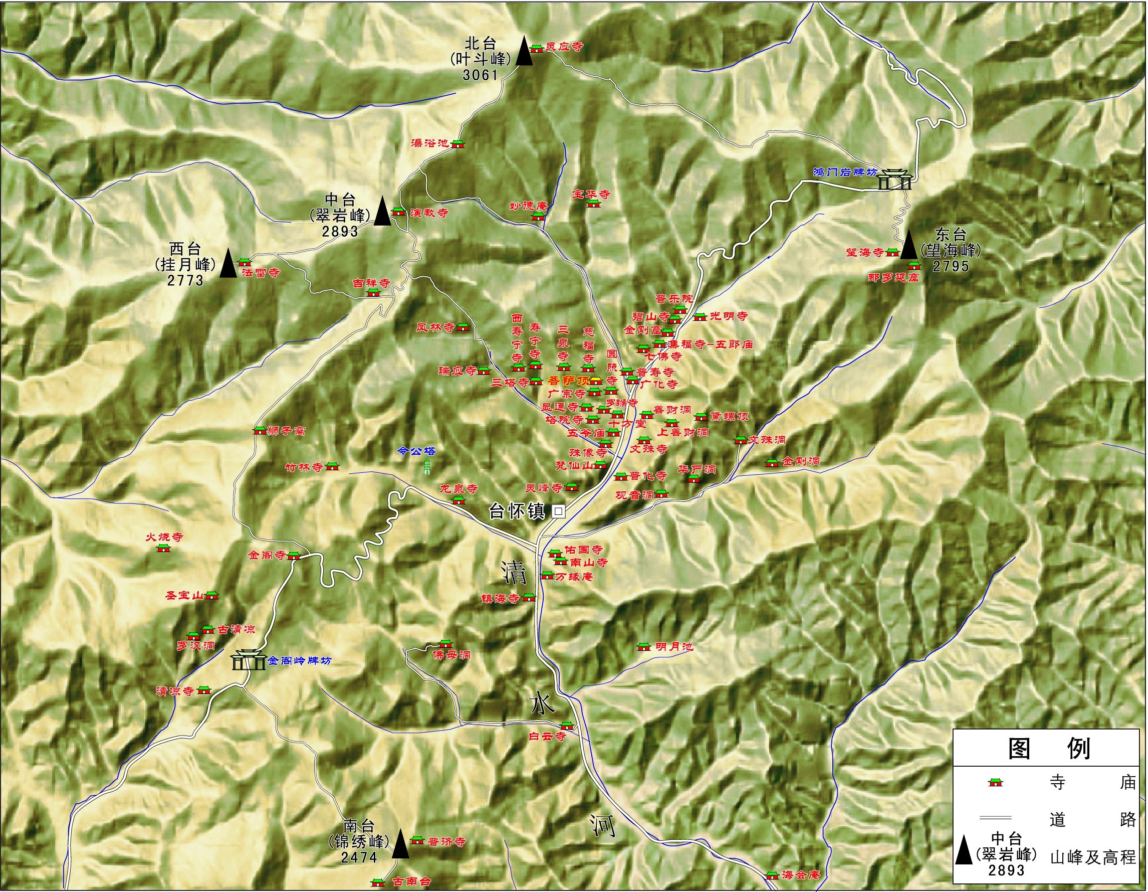 历史上的五台山寺庙五台山的寺庙建筑历史最悠久,建筑风格最多样,建筑规模最宏大,建筑特色最全面,是全国罕见的保存较好的古建筑宝库。 五台山佛寺之始,以大孚灵鹫寺为最早,当在北魏孝文帝之时。北齐时全山建有寺庙200余所。大孚灵鹫寺进一步扩建,规模之巨,冠于全山。隋唐两代, 佛教进入极盛时期。隋文帝杨坚下诏五台五顶各立一寺,并遣使在山顶设斋立碑。唐皇室自太宗李世民至德宗李适,九帝均诏敕五台,倾仰灵山。这时五台山寺庙达到360余所。在唐武宗李炎灭佛的“会昌法难”时,这些寺庙都被严重损毁,有的甚至荡然无存。入宋之后 ,五台山佛教得以恢复,但寺庙建筑与唐代比较相应缩小,见于记载的仅72所。元代喇嘛教入山,新增12佛刹,但基本上保持在宋代的水平上。明代佛教再度振兴,五台山寺庙总数回升到104所。清代全山佛寺共122处,其中喇嘛僧住持的黄庙25处,和尚住持的青庙97处。虽然圣祖康熙、高宗乾隆几次颁旨,并亲自朝台题词,寺僧也四出化缘,广求布施,使寺庙的修建有所进展,五台山的影响也有所增强,但总体来说还远不及唐代的盛况。 五台山现存寺庙68座,其中台内47座(青庙40,黄庙7),台外21座。南禅寺大殿与佛光寺东大殿,为唐代遗存的佛寺精华,在中外佛教史及建筑史上都占据重要地位。金代建筑有延庆寺大殿和佛光寺文殊殿,元代建筑有广济寺大雄宝殿和岩山寺菩萨殿,明代建筑有殊像寺文殊殿、圆照寺大佛殿 、碧山寺雷音殿、南山寺大雄殿、塔院寺木牌坊等,清代建筑有菩萨顶、万佛阁、金阁寺、罗睺寺、黛螺顶等,民国年间的建筑有尊胜寺、十方堂、龙泉寺等。这些寺庙大多依山就势,错落有致,以台怀寺庙群为中心,向五座台顶辐射,形成了既与自然景色和谐统一、又别具古刹风韵的梵宫胜境。