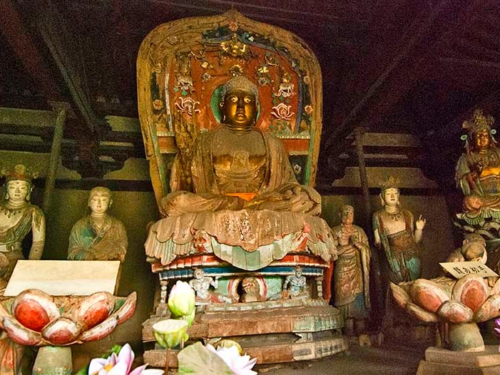 南禅寺大殿 位于五台县西22千米的李家庄村西侧。南禅寺大佛殿为我国现存最早的唐代木结构建筑。该寺创建年代不详,重建于唐德宗建中三年(782), 据寺内大殿西缝平梁下保存有唐重修进墨书题字:“因旧名大唐建中三年岁次壬戌月居戊申丙寅朔庚午癸未时重修法显等谨志”,是寺宇重建年代之证。唐武宗会昌五年(845)灭法,中国佛寺大多遭毁,南禅寺因规模较小,处地偏僻,不为世人瞩目,幸免于难。宋元明清各代曾进行过一些葺补和装绘,但唐代大殿的规制结构和殿内彩塑的造型风貌都依旧保存了下来。 寺院坐北朝南,南北长60米,东西宽51.3米,总面积3 078平方米。主要建筑有山门、龙王殿、菩萨殿和大佛殿。围成一个四合院形式。寺内正北面的大佛殿三楹,建于唐德宗建中三年(782),早于佛光寺大殿75年,是中国现存最早的唐代木构建筑。其他东西配殿、地藏殿、山门等建筑都是明、清时所建。该寺于1961年被定为全国重点文物保护单位。1973年又进行了复原性整修,恢复了唐代殿宇建筑出檐深远的浑朴豪放面貌。 大殿面阔、进深各3间,建在月台上,平面正方形,单檐歇山灰色筒板瓦顶。檐柱12根,其中3根抹棱方柱是始建时遗物。殿前有宽敞的月台,殿内无柱。殿内有一长8.4米,宽6.3米的大佛坛,坛上有唐代泥塑佛像17尊,安置在凹形的砖砌佛坛上,主像释迦,结跏趺坐于束腰须弥座上,弟子、菩萨、天王、仰望童子及撩蛮、佛霖,分列两侧。释迦牟尼塑像总高近4米,庄严肃穆,面容丰润,神态自若,服饰简洁,衣纹流畅,虽经后代装修,依然保存了唐塑风貌,是现存唐代塑像的杰出代表。寺内还保存角石2块、石狮3躯、小石塔一座,雕工精练,均为唐代原作,人们可以从中感受到唐代雍容大度、庄严健美的建筑格调和艺术性格以及高超的建筑技术。
