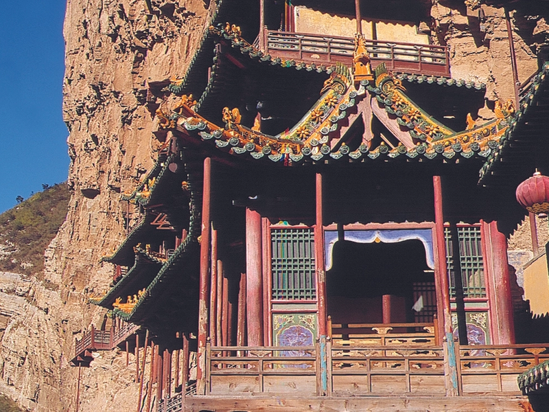 悬空寺悬空寺建在山西省浑源县恒山峡谷金龙口西崖峭壁上,距县城5千米,远远望去,整个寺院像是悬吊在半空中的琼楼玉宇,历史上以悬空寺命名,再贴切不过了。古诗曾这样描写悬空寺:“飞阁丹崖上,白云几度封”,“蜃楼凝海上,鸟道没云中”,可见悬空寺奇险诡谲、惊心动魄的景象。据《恒山志》记载,悬空寺最早建于北魏后期,距今已有1400多年的历史了。现存的寺院经历了历代的维修,其建筑风格完全属于明清时期。 全寺沿山势走向,坐西朝东,面对天峰岭,上载危岩,下临幽谷,由于悬空寺所处的特殊的地理位置,一天中最多也只能得到不足2个小时的日照。全寺不同于地域开阔的寺庙平面,不可能采取传统的对称布局。40多间大小不一的殿阁一字形排开,高低错落,形成了我国罕见的高空绝壁建筑。为了囊括更多的宗教内容,匠人们在寺院中将建筑分为三组,进入山门,以三官殿为主体建筑的道教场所,便映入视野。中间一组的建筑以三圣殿为主体,殿内则供奉释迦造像,显然是佛国世界。第三组是以三教殿为主体的建筑,殿内祀奉着三教的始祖,即儒家创始人孔子、道家祖师老子和佛教鼻祖释迦,三教殿在全寺中处于最高的位置,为三层檐九脊歇山顶。寺院的其它建筑有三佛殿、观音殿、太乙殿、伽蓝殿、地藏殿、千手观音殿等,每座建筑以三面围廊围护,相互间以栈道连接,迂回曲折,跌宕起伏,建筑结构奇特壮观。在每座建筑物的下面由许多插入石壁的木梁荷载,成为了建筑物的“台基”,在“台基”下面再支撑立柱或斜撑,使结构具有良好的稳定性,经过多次地震,悬空寺安然无恙,这是古代匠人运用力学原理成功解决复杂结构的典型范例。 关于悬空寺的修建情况,寺内有一通碑文曾记载:在一次的重修悬空寺的施工中,面对着吊在半空中的庞大的建筑群,施工难度之大使许多工匠望而生畏,不敢承担,后来一位姓张的工匠,接受了此项任务,他率领工人在山下先加工好构件,绕行几十里爬到寺院顶上的山头,然后从山上用绳索将人与加工好的构件悬在半空。匠人们就是用这样的方法,用了几年的时间,才完成了重修工程。 寺内现存的儒释道三教的造像共计78尊,所用材料有铜铸、铁铸、泥塑、石雕等,皆为明清时期的作品,是我国历史上三教合一现象的真实写照。古人镌刻在绝壁上的“公输天巧”四个大字,高度概括了创造悬空寺的工匠们高超的建筑技术。寺中现存李白所书“壮观”的石碑,勾勒出唐代时悬空寺的壮观景象。在众多记述悬空寺重修的碑刻中,金大定十六年(公元1176年)重修碑是最早的,为研究悬空寺的历史沿革提供了依据。