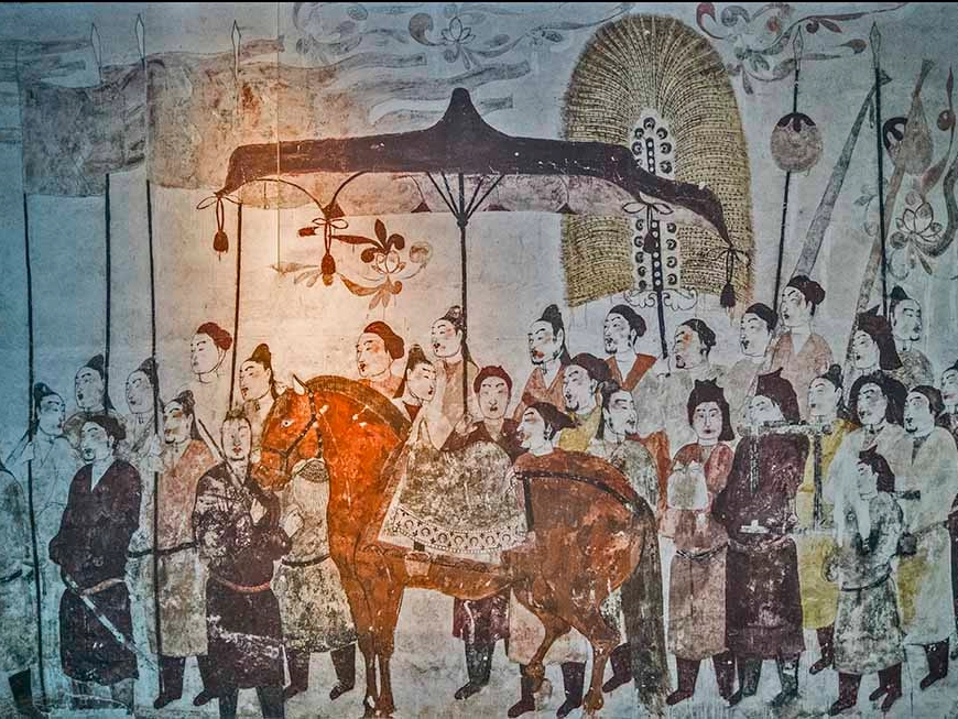 王家峰墓群 墓群由徐显秀墓、狄湛墓、厍狄业墓等组成,其中以徐显秀墓最具代表性。 徐显秀墓位于太原市迎泽区郝庄镇王家峰村东“王墓坡”,被评为“2002年全国十大考古新发现”之一。墓室出土器物共计500余件。其中陶俑320余件,瓷器约200余件。墓中出土的一件可能来自中亚乃至地中海地区的镶嵌宝石金戒指,反映了当时中外文化交流情况。壁画是这次考古发掘最重要的收获之一。遍布全墓的彩绘壁画保存基本完整,共约330平方米。徐显秀墓壁画分为墓道和墓室两部分,墓室壁画分上下两层。上层是天象图,下层壁画环绘四壁,是墓主生前的生活图景。正面北壁为宴饮图,西壁是墓主准备出行的场面,东壁是墓主夫人即将出行的场面,南壁门洞画面是东西两壁的延伸和继续。徐显秀墓是目前发现的同时期保存最完整的大型壁画墓,为研究这一时期墓葬的营制以及对隋唐墓葬制度的影响、墓葬壁画艺术的发展提供了重要的资料。