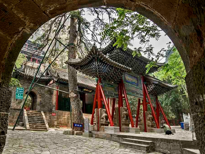 藏山祠 位于盂县县城北25千米的藏山村东。藏山原名盂山,相传春秋时晋国程婴藏赵氏孤儿于此,故称藏山。藏山祠创建年代不详,金大定十二年(1172)重修,元、明、清历代屡有修葺。祠址向南,依山建造。建筑分布于三层递高的平台上,祠前为明代“藏孤胜境”牌楼,祠内中轴线上依次布列山门、乐台、正殿、寝宫、梳妆楼,东西两侧为钟鼓楼、配殿和耳殿。除寝宫部分梁架保存金代风格外,余皆清代建筑。正殿面宽五间,进深三间,单檐歇山顶。殿内山墙和北壁绘壁画69平方米,以连环画形式表现赵武生平。