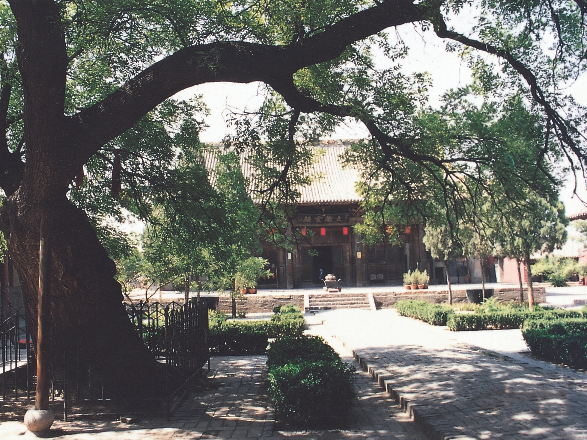 双林寺双林寺坐落在平遥县城西南6千米的桥头村,平遥县曾在春秋时设中都邑,汉时又置中都县,北魏太平真君九年(公元448年)时将中都县迁至榆次县,中都故城遂废。寺中北宋时的《姑姑之碑》记载:中都寺创建于北齐武平二年(公元571年)。从武平二年上溯至太平真君九年,已有123年的时光,123年后创建寺院并取名中都,看来寺院的创始人,颇有一些怀旧的伤感。碑文还叙述了寺院更名的原因:建成后不久,寺遭兵火,宋时重新营造,取佛经典籍中的“佛陀双林入灭”即释迦圆寂之说,改中都寺为双林寺,寺院的名称真正具有了佛教的意义。宋以后的几个朝代里,双林寺进行了多次的维修,但600年前的明代工匠,馈赠给我们的建筑和彩塑艺术依旧风韵不减。 寺院由三进院落组成,中轴线上排列着山门、天王殿、弥陀殿、大雄宝殿、佛母殿,前院配有罗汉殿、地藏殿、关圣殿和土地殿,释迦殿的左右两侧,钟鼓二楼对称矗立。宽敞的中院,有千佛殿和菩萨殿,大雄宝殿东北角的贞义祠,把明代民间的传统文化内容搬进了佛教寺院。后院比较特别,仅有一座佛母殿,两侧没有配殿或厢房。寺院布局严谨,规模较大,占地约14000多平方米。 寺内的天王殿、释迦殿、大雄宝殿、佛母殿等主要建筑的屋顶形式多为歇山顶或悬山顶,四座大殿的面宽均为五间,进深为三间或四间不等,五踩如意昂的斗拱形制,表现了明清时期的风格。千佛殿和菩萨殿的面宽,比中轴线上的主殿多出两间,显然是为了安置众多的塑像所致。双林寺的10座殿宇,庇护着2052尊举世闻名的彩塑走过了明清两代。 双林寺中的彩塑艺术,最有代表性的,当首推罗汉殿内的十四尊罗汉坐像,这些塑像不仅造型生动,而且人物神态各异,性格鲜明,通过写实的手法,对人物的性格、身世和不同年龄的刻划,准确地表现了罗汉们各自的内心世界,这是一组风格独特、技法精湛的古代艺术精品,艺术价值极高。天王殿内的四大天王,造型雄浑有力;千佛殿内的韦驼,雄健威武,气宇轩昂;释迦殿的渡海观音,姿态优美自然,均为不可多得的艺术珍品。菩萨殿和千佛殿内的上千尊悬塑,大多高40厘米左右,这些彩塑描绘了佛教中的故事,富有强烈的动感,场面宏大,与永乐宫的壁画相比,有着异曲同工之妙。这座东方艺术宝库所产生的艺术魅力,正吸引着国内外的许多游客前来观赏。