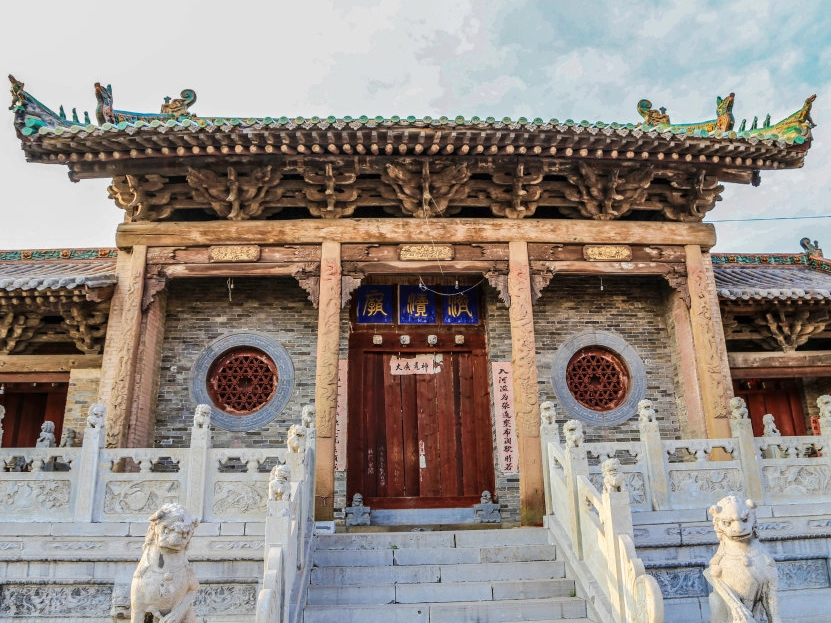 建南济渎庙济渎庙 ,位于高平市建宁乡建南村翠华山巅,是祭祀济水之神的庙宇,创建年代不详,清康熙二十二年(1683)重修。坐北朝南,依地势逐级向上,错落有致。三进院落,规模宏大,布局完整。现存有山门、仪门、前殿、后殿、左右耳殿、东西厢房、配殿等。为第七批全国重点文物保护单位。 山门(倒座戏台),清代建筑。坐于高台之上,前出踏道。面阔三间,进深四椽,单檐悬山顶,灰筒板瓦布顶,琉璃剪边,当心间施板门,次间置圆窗。柱头科五踩双下昂,平身科每间一朵,五踩双翘出斜翘,大斗制成梅花形。方形抹角盘龙石柱,收分显著,所雕图案采用高浮雕的手法,龙身弯曲,张牙舞爪,击于碧波,翔于青天,姿态飞扬,动势强劲。山门背后为倒座戏台,面阔三间。 仪门,两侧置耳门,主体结构保持元代特征,檐下斗栱于清代改建。面阔三间,进深四椽,单檐悬山顶,灰筒板瓦覆顶,琉璃剪边,当心间施板门。檐柱用原材,柱身短粗,收分显著,卷杀明显,粗大阑额座于柱头之上,柱间用普柏枋连接,下施栱形雀替承托。檐下斗栱九踩四翘,柱头科出斜翘,平身科每间一朵。梁架结构为四椽栿通搭前后檐用两柱。 前殿,明代建筑,面阔五间,进深六椽,悬山顶,灰筒板瓦覆顶,琉璃剪边,前出廊,柱头科五踩双下昂出斜翘,里转双翘,平身科每间一朵,五踩双翘,梁架结构为五架梁对前双步梁用三柱,草栿,砌上露明造。山墙之上残存同时期壁画,被白灰覆盖。地栿石雕狮子滚绣球、花卉图案。北墙外侧照壁壁心丢失。 后殿,元建明修,面阔五间,进深六椽,悬山顶,琉璃剪边。前出廊,斗栱五铺作双翘,柱头科出斜翘,平身科每间一朵,明间里转挑斡后尾插入垂莲柱,次间、梢间挑斡后尾抵下金檩下皮。梁架结构仍为元代风格,为四椽栿对前乳栿用三柱,草栿做法,自然弯材稍加修整,砌上露明造。